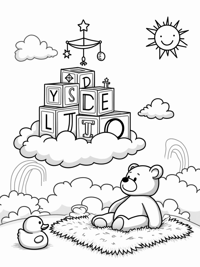 Imagine a nursery high up in the sky, surrounded by fluffy clouds! Here, giant pastel building blocks create a cozy fortress, each one covered in colorful letters and numbers. Above it, a mobile spins gently, featuring twinkling stars and cheerful moons. Below, a plush teddy bear is lounging on a soft blanket, enjoying the company of oversized rubber ducks and spinning tops.