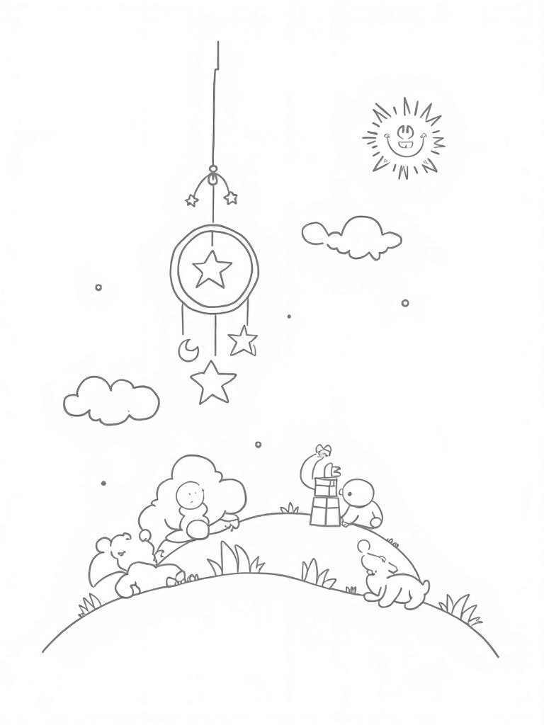 This coloring page shows a dreamy nursery floating high among fluffy clouds. Above, there's a giant mobile filled with colorful stars and moons that twinkle in the sky. Below, a gentle hill made of soft pillows creates a cozy landscape, perfect for little ones to play on.