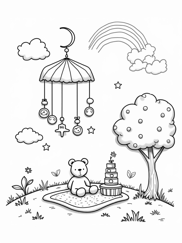In this adorable scene, a nursery is floating high among the fluffy clouds. Above, a giant mobile spins, showcasing oversized stars, moons, and playful animals that are just waiting to be brought to life with color. Below, a soft blanket is spread across a grassy patch, where a plush teddy bear lounges next to a colorful stack of building blocks, perfect for little hands.