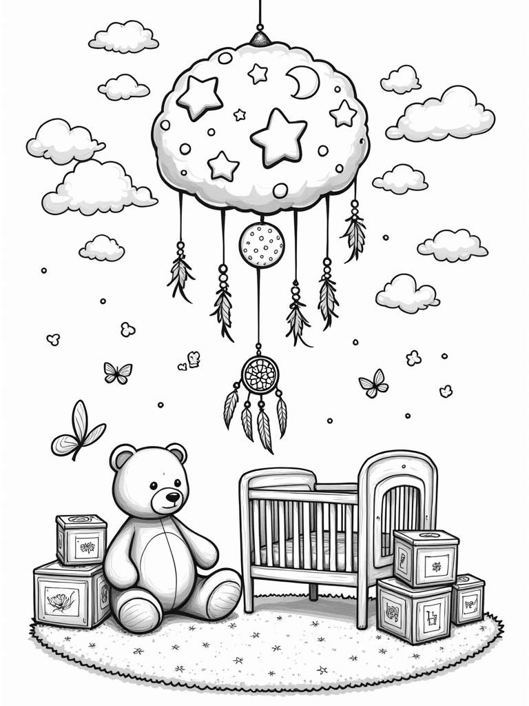Grab your favorite crayons or markers and bring this whimsical scene to life! Whether you choose bright colors for the mobile or soft pastels for the clouds, there’s no wrong way to color this page. Let your creativity soar in this delightful nursery scene!