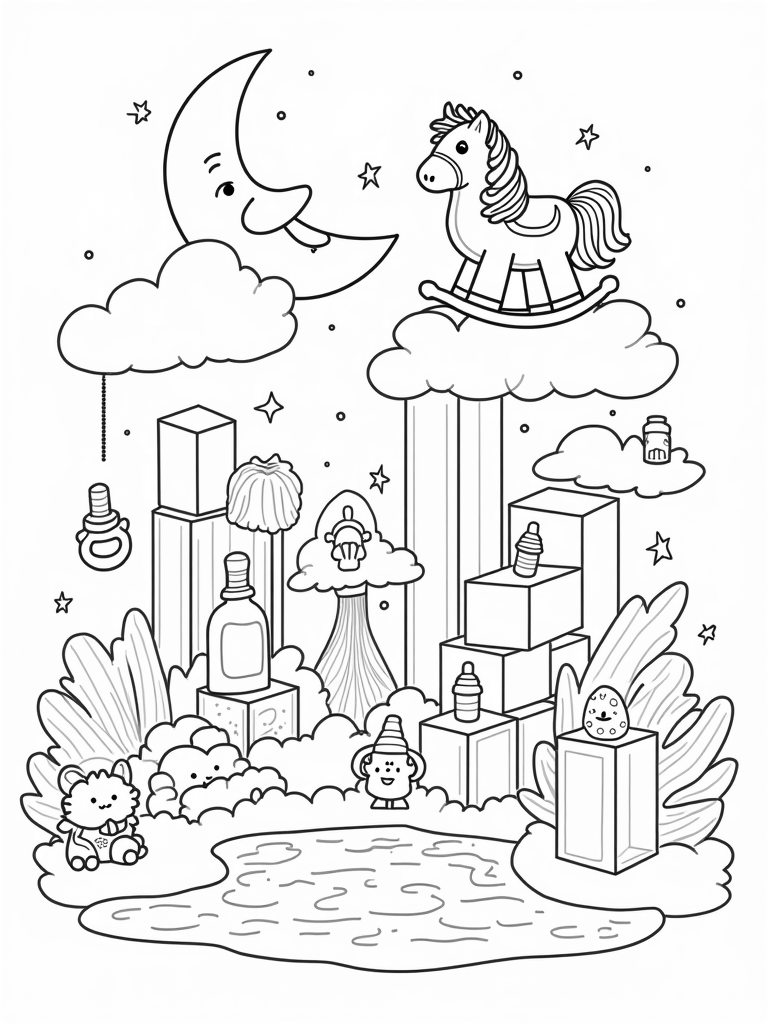 Imagine a nursery that feels like a dream! This coloring page showcases giant pastel blocks that form a colorful wall, making the perfect backdrop. Right at the center, there’s a cuddly plush rocking horse sitting on a fluffy cloud, its mane flowing like pretty ribbons. Can you spot the giant pacifier hanging from a crescent moon? It’s casting a soft, gentle glow, adding to the magical vibe!