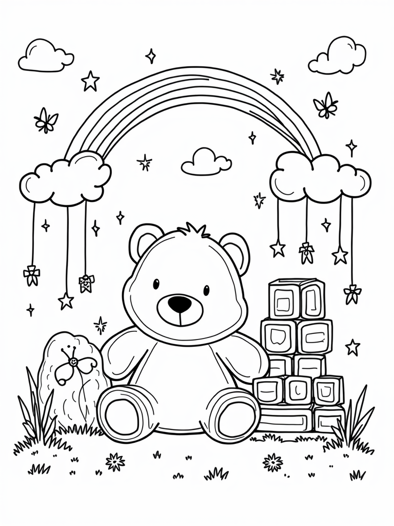 This delightful scene captures a cozy nursery filled with oversized, cuddly toys. Right in the center, a giant plush bear sits under a colorful mobile adorned with stars and moons, creating a dreamy atmosphere. Nearby, you can see a stack of building blocks forming a tower, with one cheeky block balancing at the top, just waiting for a little artist to bring it to life with color!