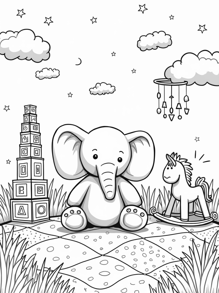 This scene has a giant plush elephant that looks so soft and cuddly, it’s hard to resist! Nestled under its big ears is a cozy patchwork quilt, bursting with fun patterns that are just waiting to be filled with colors. You’ll also spot a towering stack of colorful building blocks nearby, each one featuring simple shapes and letters, perfect for little learners.