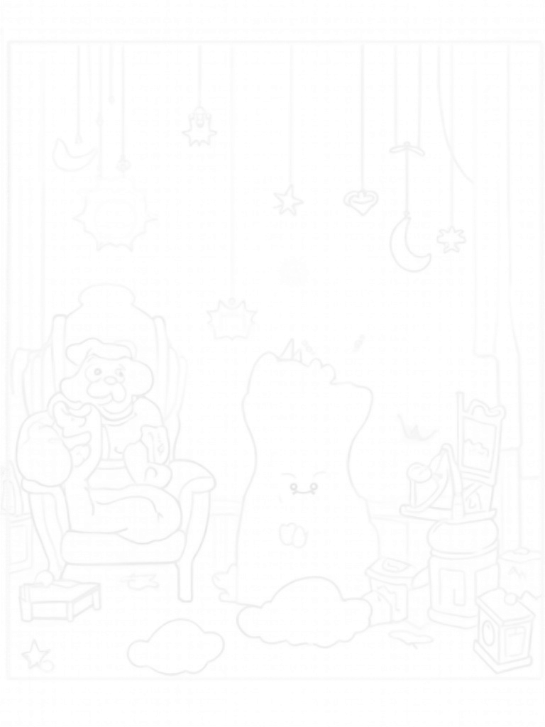 This coloring page shows a delightful nursery filled with giant plush toys that double as adorable furniture. Imagine a towering teddy bear that you can snuggle up to as a cozy armchair, while a whimsical rocking horse swings gently next to a fluffy cloud-shaped ottoman. There’s a mobile of twinkling stars and crescent moons hanging above, creating a dreamy atmosphere with soft pastel colors blending all around.