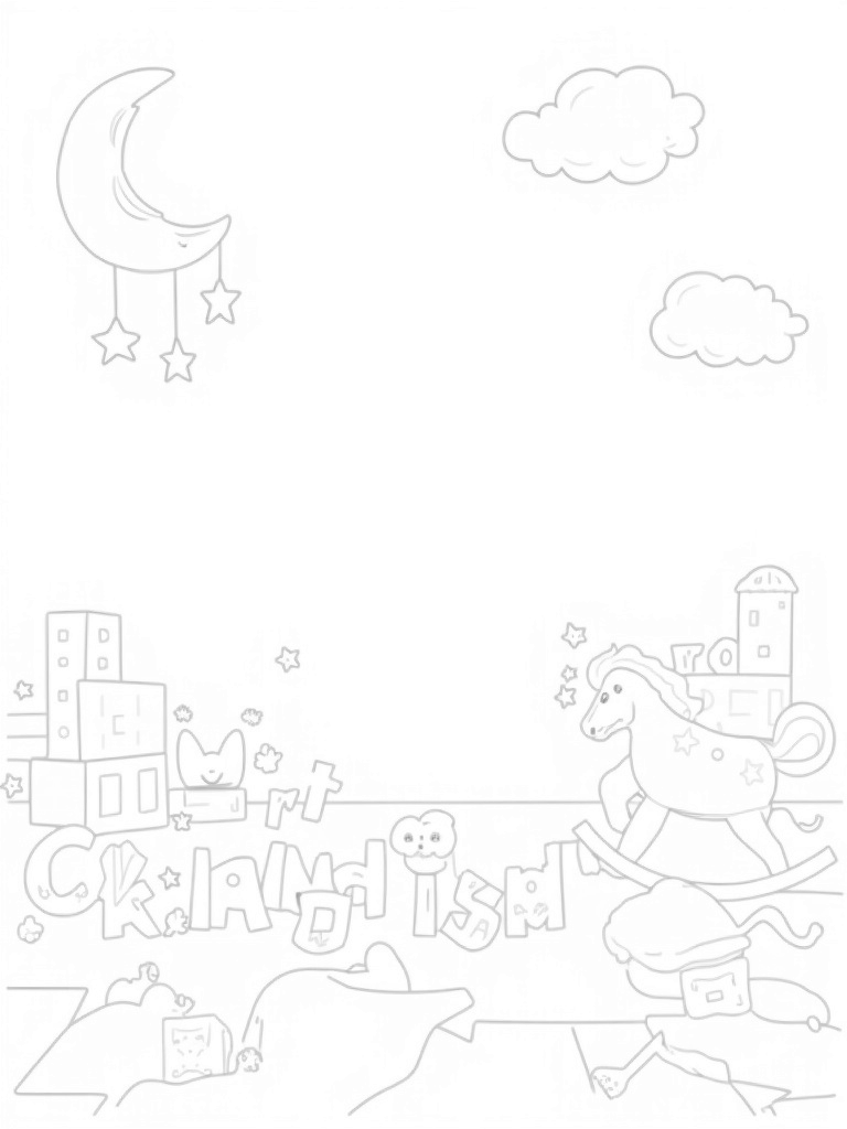 This fun coloring page showcases a delightful nursery landscape filled with oversized plush toys. At the heart of the scene, a giant rocking horse stands tall, inviting little ones to imagine all the adventures they could have. Surrounding it is a cozy quilted patchwork floor that adds a warm touch, perfect for playtime.