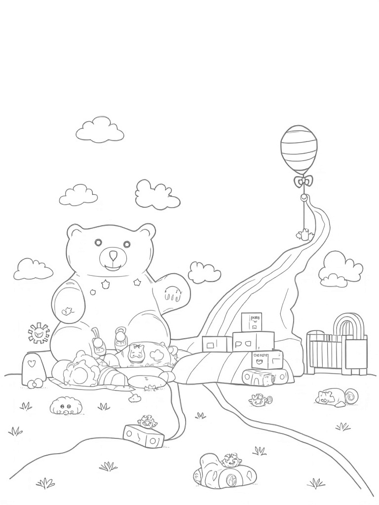 This free, printable coloring page features a playful nursery landscape with a giant teddy bear, colorful building blocks, and plush animals. Perfect for little artists looking to bring this whimsical scene to life with their favorite colors!