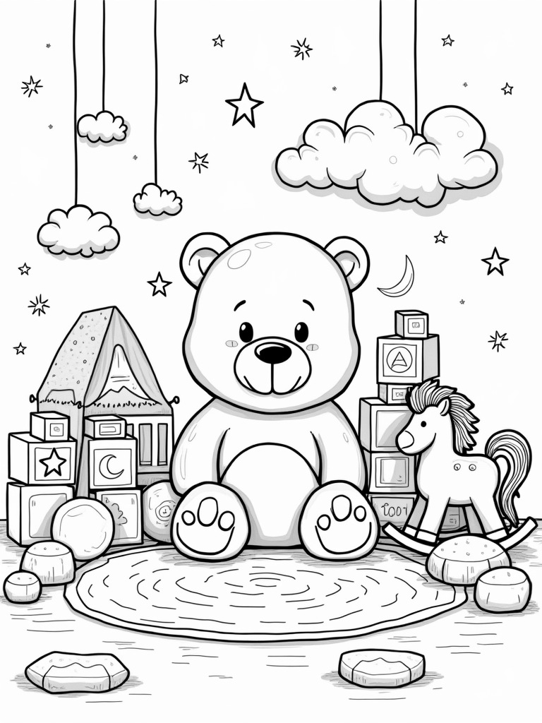 Giant Teddy Bear and Playful Nursery Scene Coloring Page
