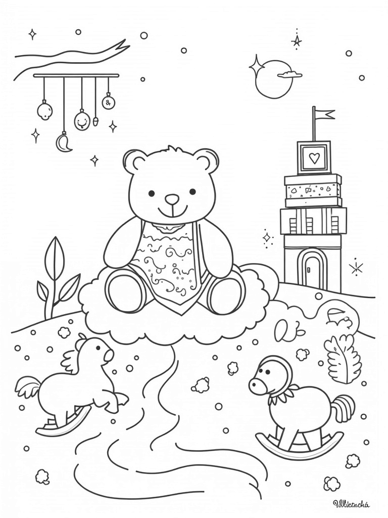 Check out this free, printable coloring page featuring a giant teddy bear and a magical nursery landscape. Perfect for little ones, this fun scene is sure to inspire creativity during coloring time!