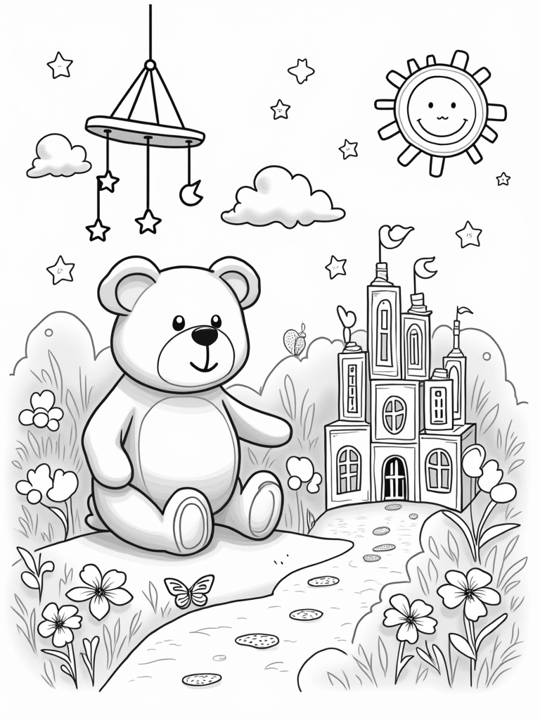This coloring page shows a giant plush teddy bear sitting happily under a colorful mobile filled with stars and moons. Nearby, oversized building blocks stack up to create a little castle, while a fluffy cloud floats lazily above. A cheerful sun with a big smile watches over everything, and a winding path made of tiny footprints leads to a unique crib shaped like a giant leaf, decorated with lovely flowers and fluttering butterflies.