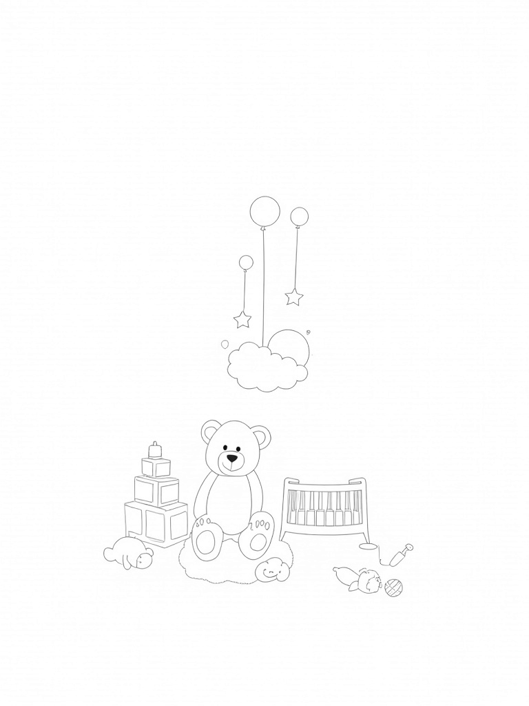 Look closely, and you'll see a mobile of twinkling stars and moons gently swaying from the ceiling. On one side, there’s a tower of building blocks waiting to be colored in bright shades, while a cozy crib sits nestled among adorable pillows shaped like friendly animals. Don’t forget the cheerful baby bottles and rattles scattered around the floor, perfect for bringing this playful scene to life with your favorite colors!