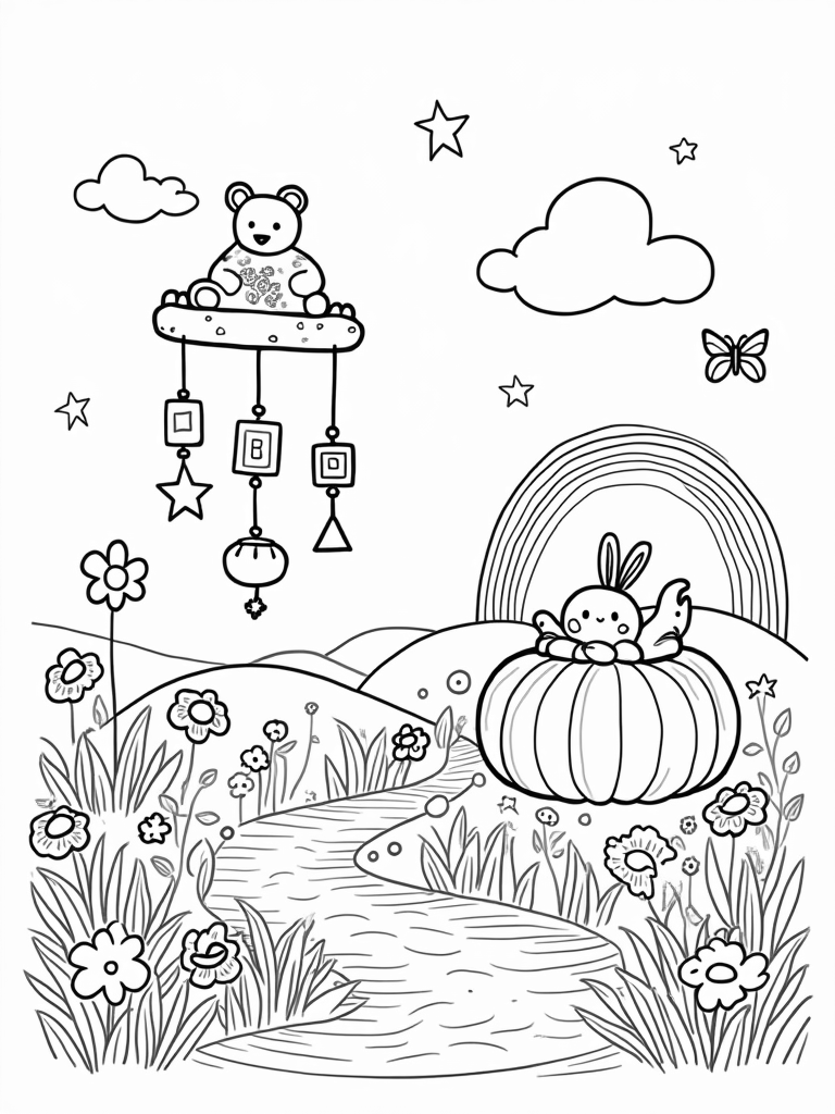 In the distance, there’s a cozy crib shaped like a pumpkin, nestled under a rainbow arch. It looks like the perfect spot for sweet dreams. All around, playful butterflies dance in the air, adding a touch of whimsy to this enchanting scene. Grab your crayons and let your imagination soar!
