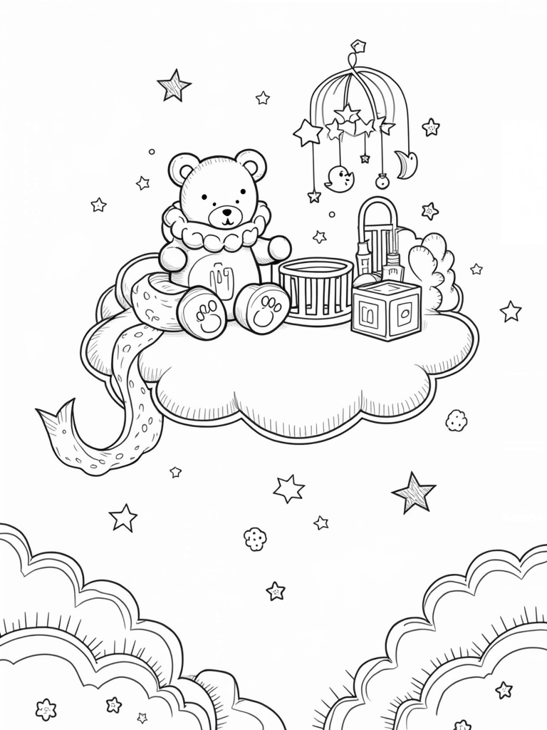 This adorable free printable coloring page features a nursery on a fluffy cloud, complete with a teddy bear and a starry mobile. Perfect for little ones to color in, it's a fun way to spark creativity while enjoying some quiet time in the baby category.