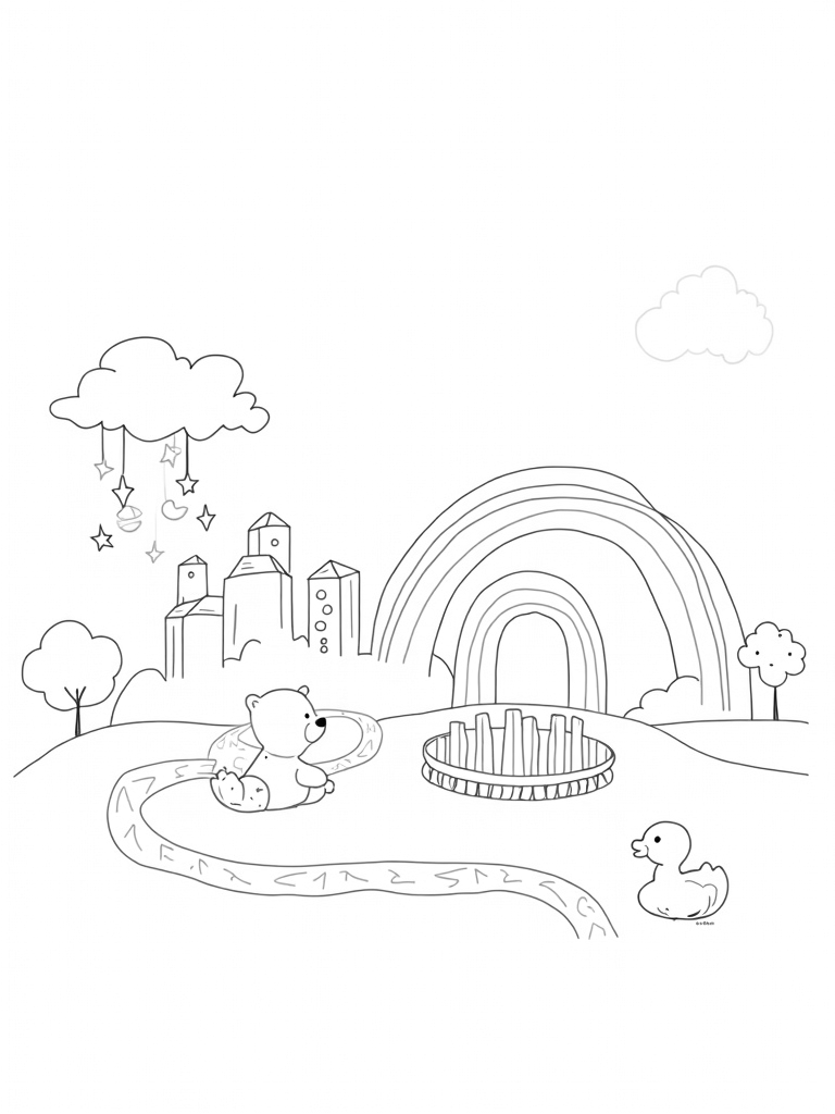 This free, printable coloring page is perfect for babies and toddlers, featuring a playful nursery scene with a teddy bear, rubber ducks, and a rainbow. Let your little ones bring this imaginative landscape to life with their favorite colors!