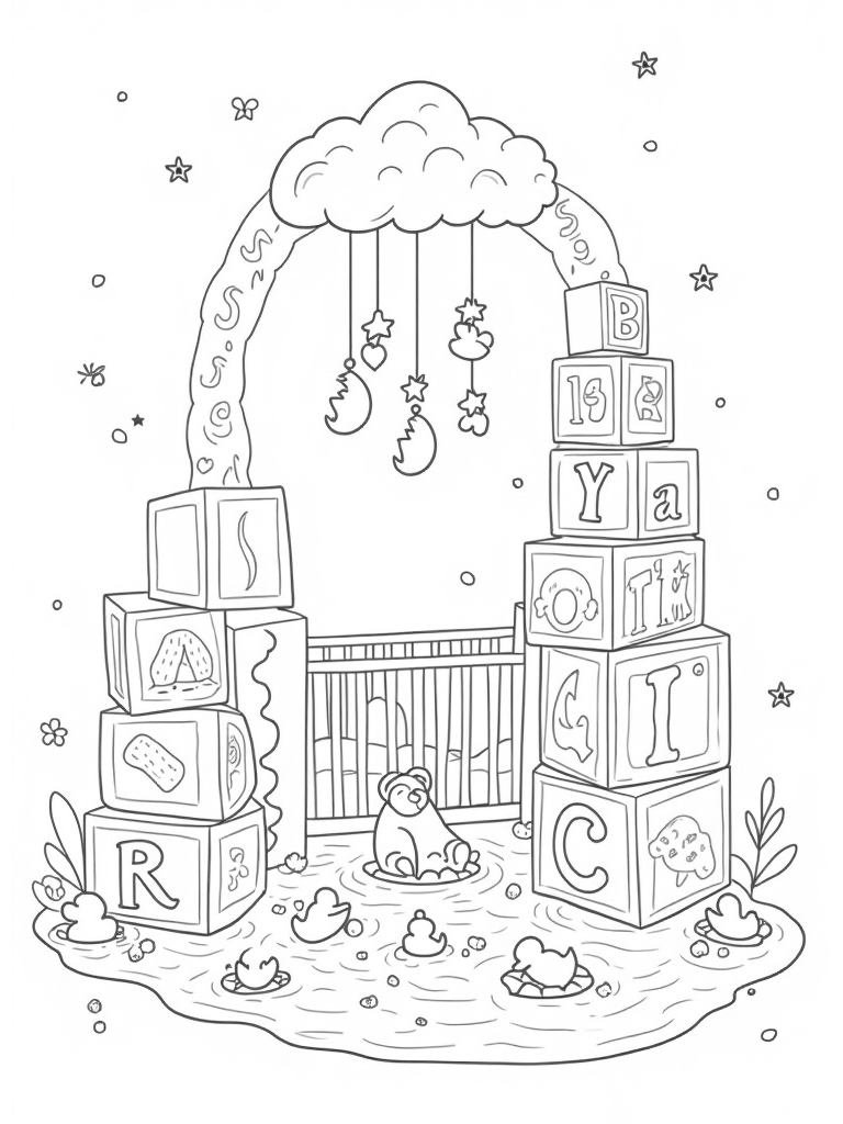 Oversized Building Blocks and a Cozy Crib Nursery Scene Coloring Page