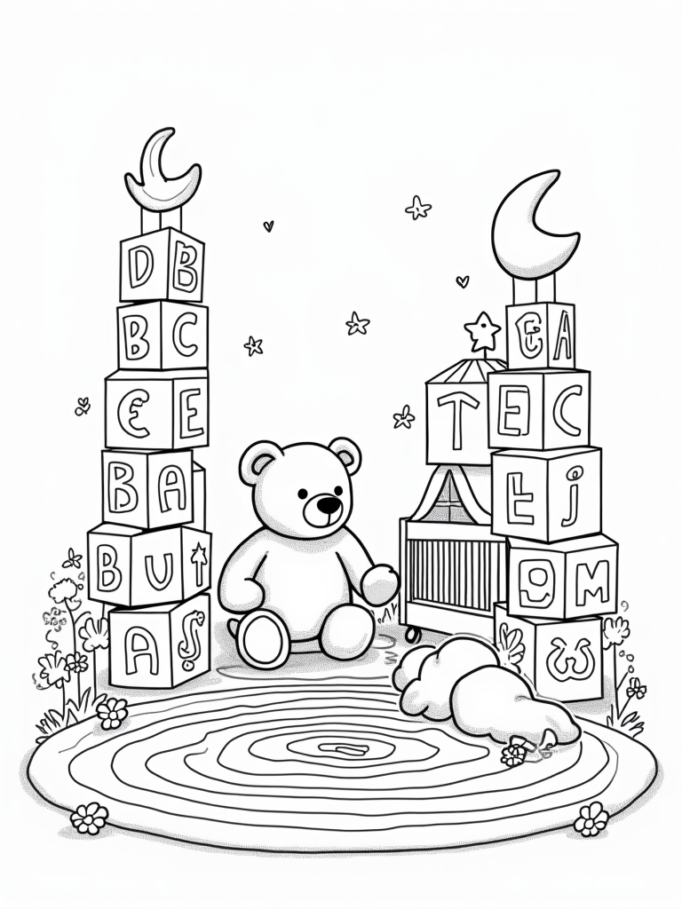 Oversized Building Blocks and a Giant Teddy Bear in a Nursery Coloring Page
