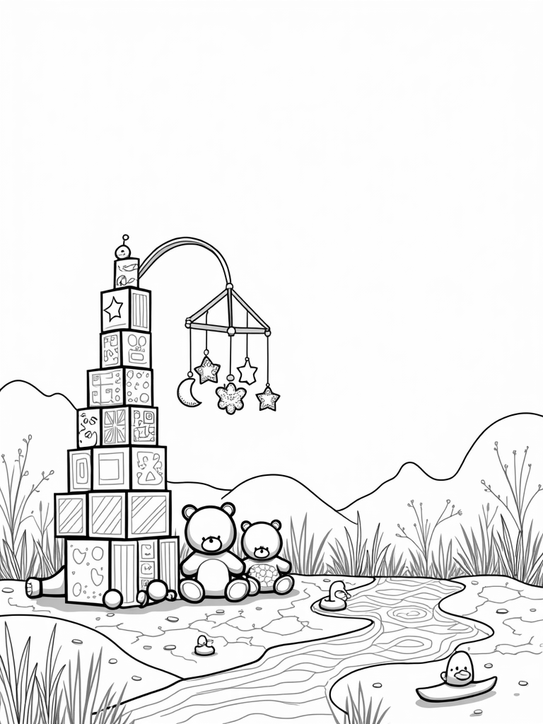 Imagine a cozy nursery filled with oversized building blocks stacked high into a colorful tower! Around the base, you'll find adorable plush stuffed animals sitting in a semicircle, each one covered in unique patterns that are just begging to be colored. Above them, a giant mobile dangles, featuring whimsical stars, moons, and little birds that seem to be flying right above the fun.