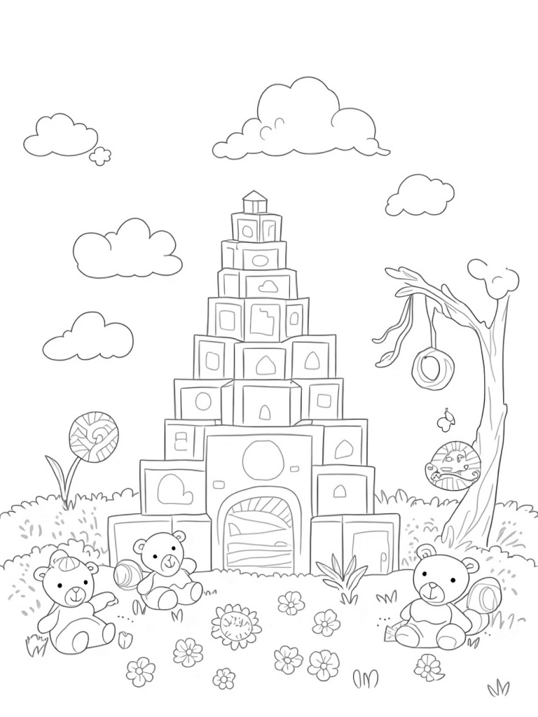 This free, printable coloring page features a whimsical nursery landscape with a castle of oversized building blocks, fluffy clouds, and a cozy teddy bear meadow. Perfect for little ones, it invites creativity and fun in every stroke!