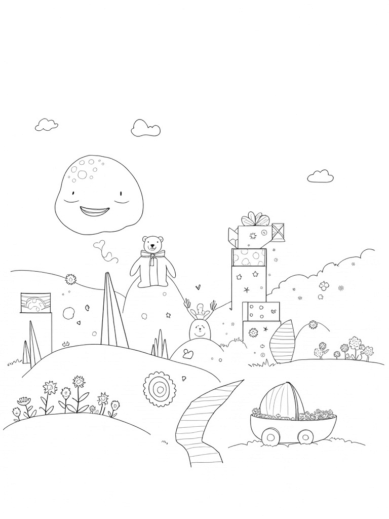 If you look closely, there’s a winding path made of bright rattles leading to a shell-shaped cradle nestled among blooming flowers. The flowers add a touch of nature to this whimsical landscape, making it perfect for little ones to color. There’s so much to explore in this illustration, and each crayon stroke can bring it to life!