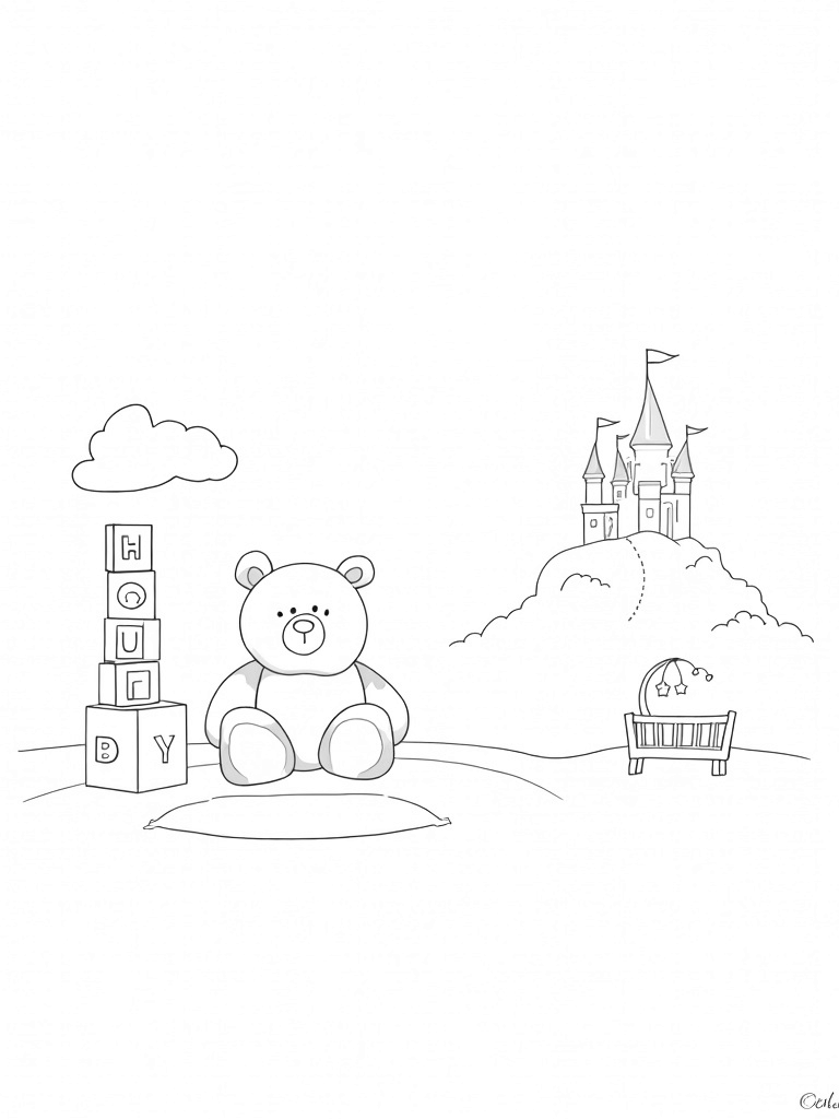 In the background, there’s a rolling hill made of plush blankets leading to a dreamy crib shaped like a castle. It’s topped with tiny flags that sway in the breeze, making it feel like a true fairytale. This nursery landscape is all about comfort and creativity, inviting little artists to bring it to life with their favorite colors. What colors will you choose for the bear? Will the blocks be bright or pastel? It’s all up to you!