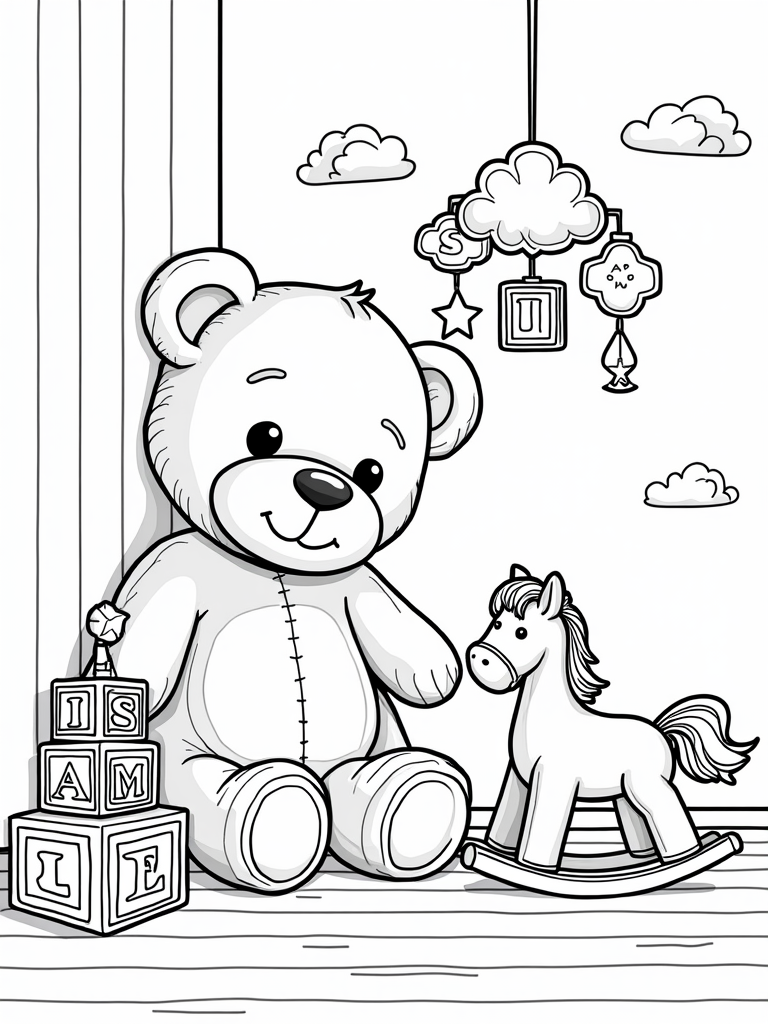 Check out this free, printable coloring page featuring a cozy nursery filled with oversized toys. Perfect for little artists who love to color and explore their imagination in a fun, baby-themed setting.