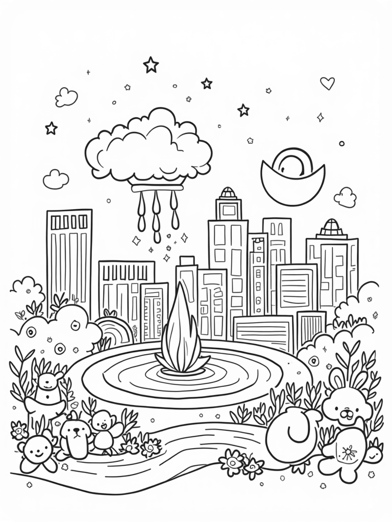 Playful City Skyline with Building Blocks and a Giant Pacifier Fountain Coloring Page