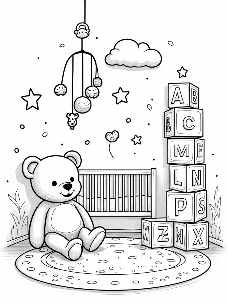 The floor is decorated with a vibrant pattern of baby rattles and pacifiers, creating a joyful environment for kids. This coloring page invites children to bring their own colors to this enchanting nursery. Whether they choose bright pinks for the teddy bear or soft blues for the walls, each child can make this space uniquely theirs!