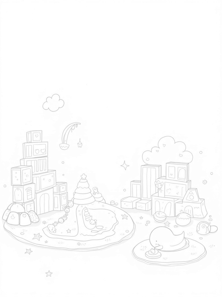 Playful Tower of Building Blocks and Plush Toys Coloring Page