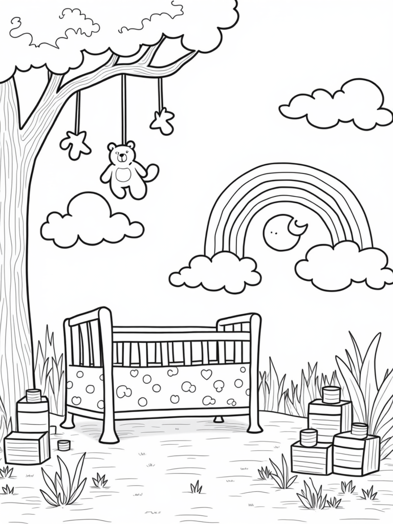 In the background, a soft rainbow stretches across the sky, while a sleepy sun peeks out, casting cheerful rays onto a patch of flowers that look like baby bottles. It’s a vibrant, happy place where imagination runs wild. Each element invites kids to bring their own colors and creativity to life, making this nursery landscape even more special!