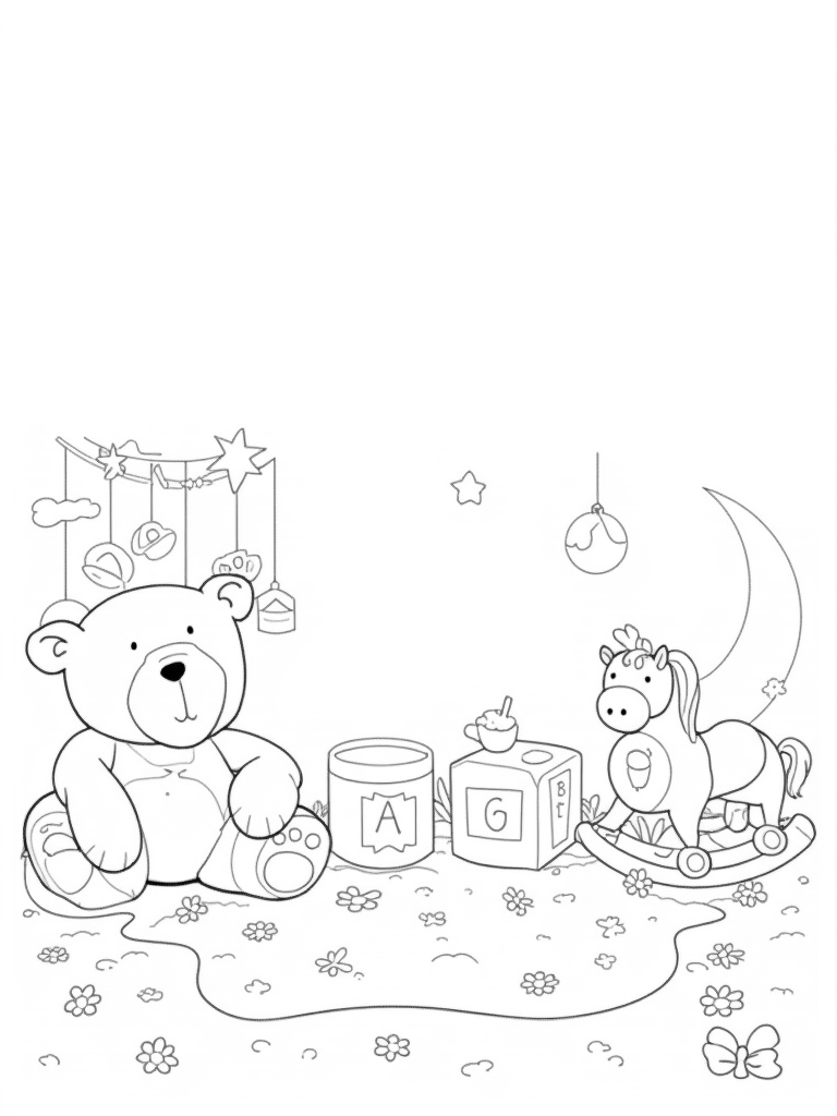 Check out this adorable, free, printable coloring page featuring a teddy bear nursery! With a giant mobile, a plush toy train, and a rocking horse, it’s perfect for little ones who love to color and play.