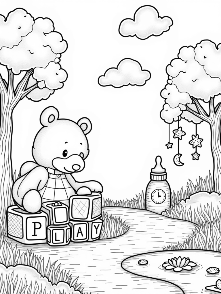 Check out this free printable coloring page featuring a teddy bear in a whimsical nursery landscape! Perfect for little artists who love cute scenes and fun colors. Grab your crayons and let the creativity flow with this adorable coloring page for babies!