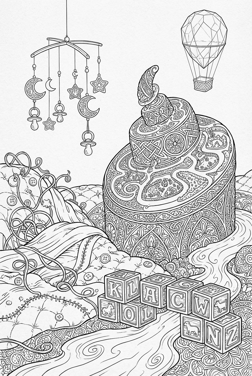 Imagine a little island made entirely of a teething ring, perched in a gentle stream of warm milk. The ring’s curved grooves turn into winding paths you can follow with a crayon. Next to it sits a fluffy diaper hill, its soft folds and elastic bands look like vines ready for a splash of color. Above, a pastel mobile drifts – moon‑shaped rattles and star‑shaped pacifiers hanging from a crystal‑clear cradle balloon. Scattered wooden blocks form a delicate bridge over the milk river, just waiting for tiny footsteps.
