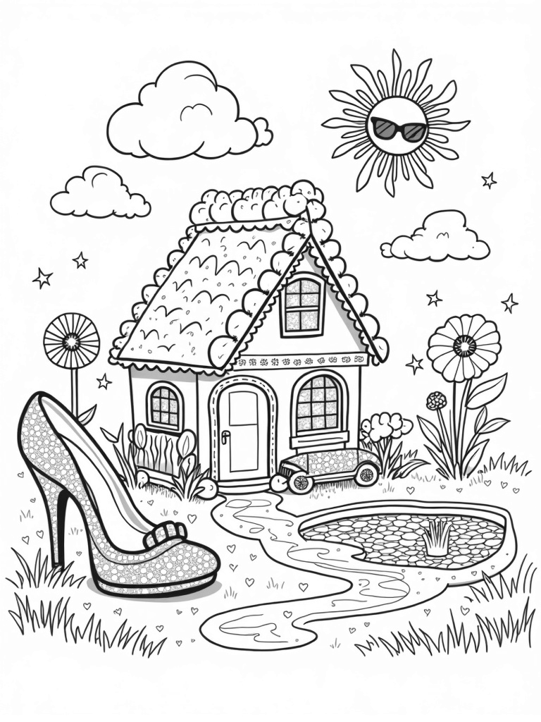 Candy Dreamhouse with Sparkly High Heel and Pool Coloring Page