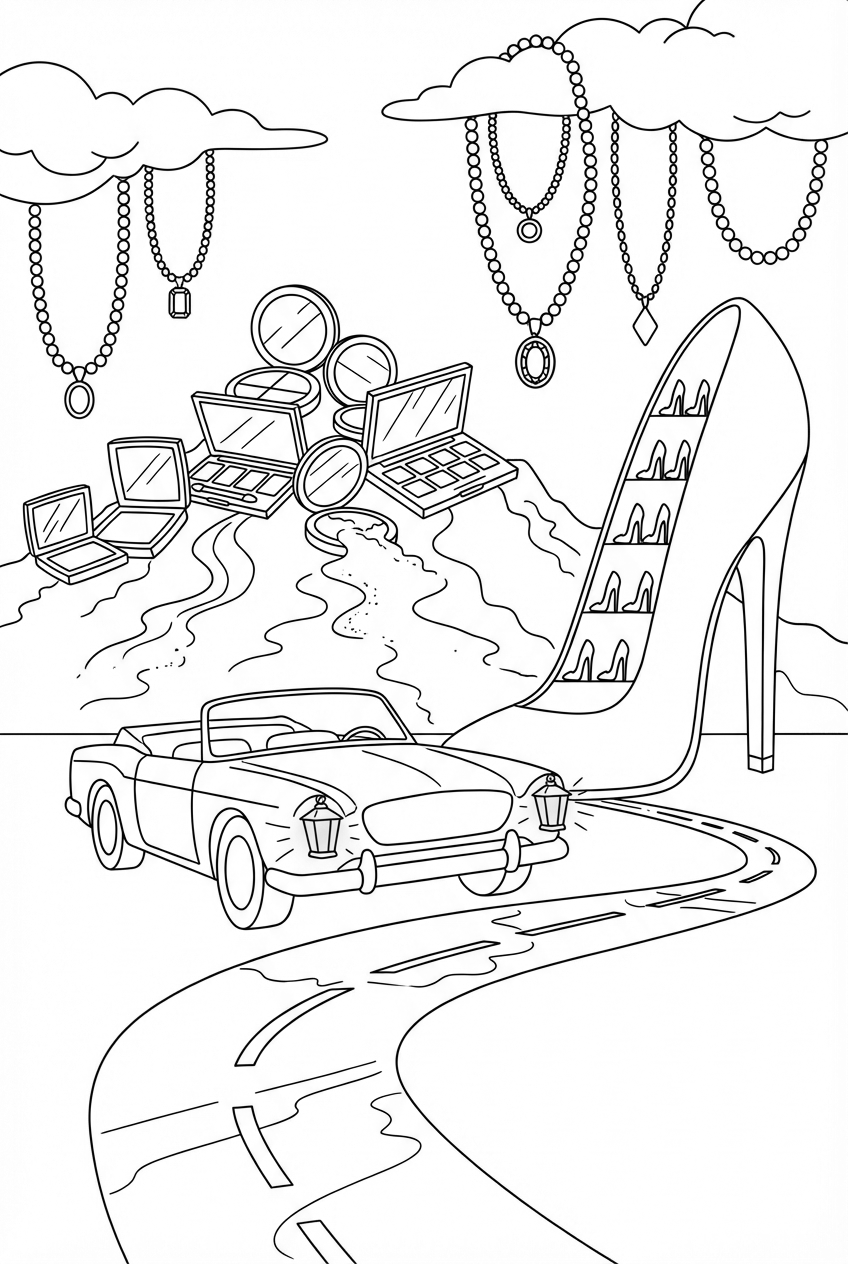 Even though it’s all line art, you can imagine the convertible’s glossy finish and the runway’s shine. The skyscraper’s heels give it a playful, fashion‑forward vibe—perfect for Barbie fans who love a twist on cityscapes. The makeup palettes add splashes of color just waiting for crayons or markers, and the necklace waterfalls? Think of them as sparkling streams you can make shine however you like. It’s a crazy, fun mash‑up that sparks the imagination while keeping the outlines clean for easy coloring.