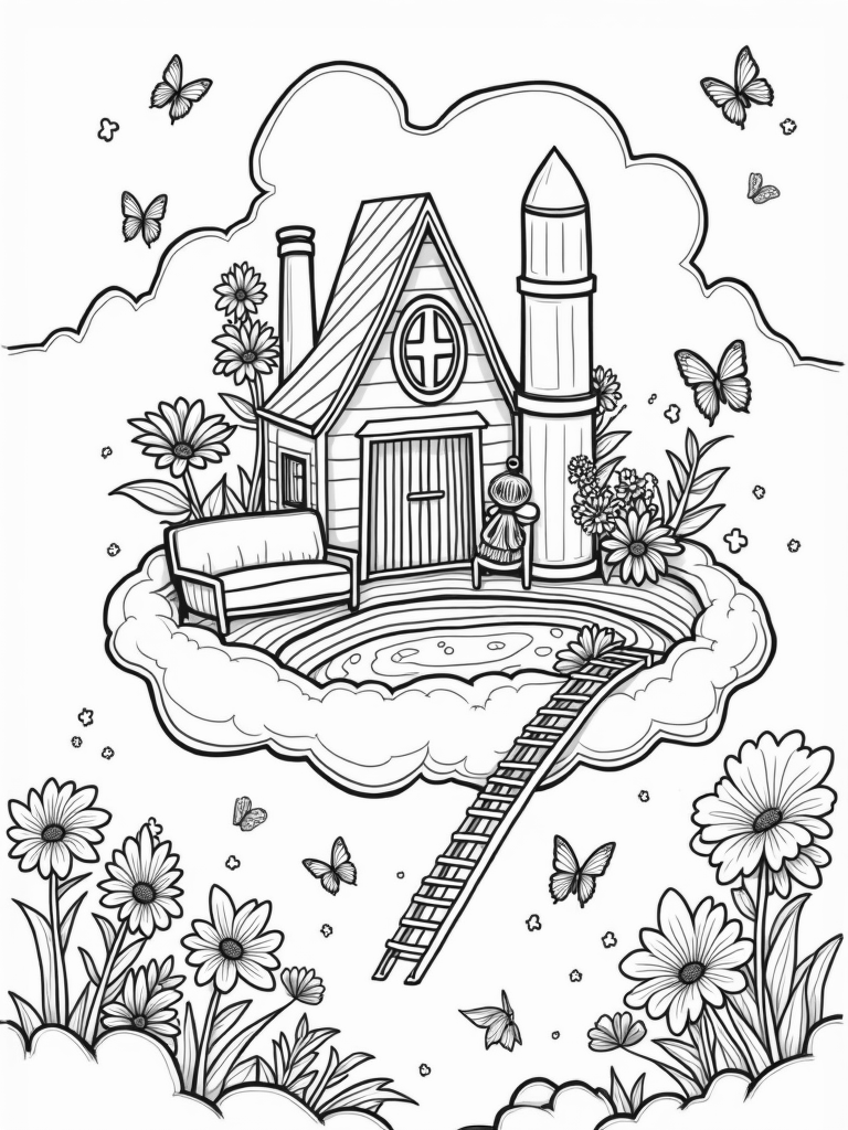 A rainbow bridge connects to a floating garden, where shimmering butterflies flutter about. It’s like a scene straight out of a fairy tale! This coloring page is not just about colors; it’s about letting your imagination run wild as you add your own creative touch to this whimsical world.