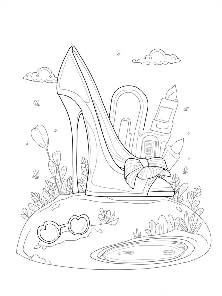 Leaning against the shoe-shaped house are some oversized accessories that will make you smile. There's a massive pink bow and a giant pair of sunglasses, making the whole place feel extra playful and stylish. And let’s not forget the fluffy clouds shaped like lipsticks floating in a bright, cheerful sky, casting fun shadows on the ground below.