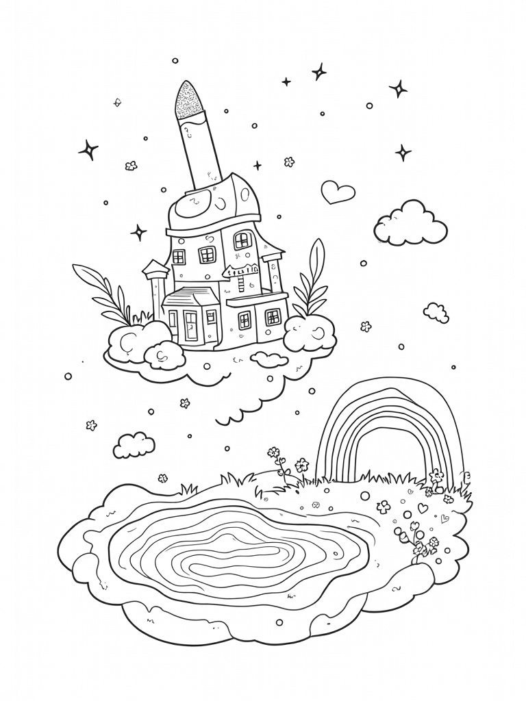 Just nearby, a rainbow-colored staircase spirals up to a star-shaped swimming pool filled with swirls of color. Can you picture it? It’s a perfect spot for a splash of fun! Plus, floating hearts and stars sprinkle the sky, adding a playful twist to this enchanting landscape. Get your crayons ready to bring this whimsical scene to life!