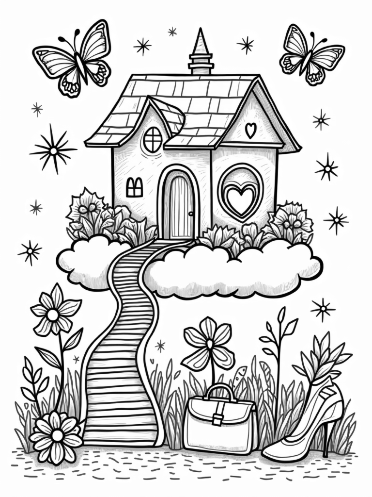 Imagine a dreamy house floating on a soft, fluffy cloud! This whimsical dreamhouse has oversized heart- and star-shaped windows that invite you to peek inside. Surrounding the house are giant, swirling flowers that add a pop of color to the pastel sky. Below, a vibrant rainbow staircase spirals down to a magical garden filled with enormous fashion accessories. Can you spot the giant sunglasses, the colossal handbag, and the enormous high-heeled shoe? It’s like a fashionista’s paradise!