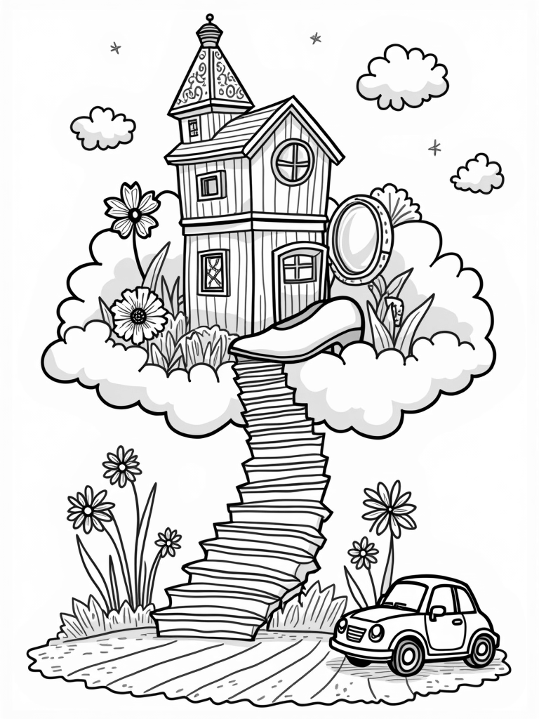 Dreamhouse in the Clouds with Colorful Toy Car Coloring Page