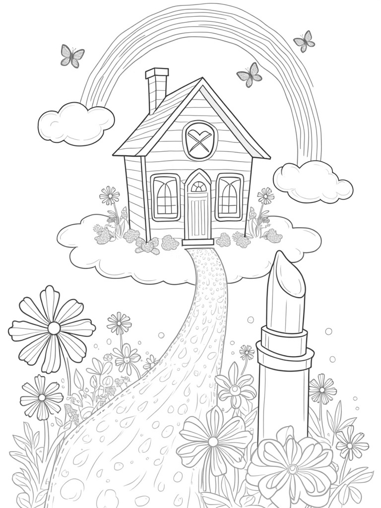 But wait, there’s more! Just nearby, a giant lipstick tube stands tall like a tower, surrounded by sparkling waterfalls of nail polish. Can you picture it? It's like a dream come true! And let's not forget the sky. A beautiful rainbow arches above, filled with playful butterflies that have the coolest kaleidoscopic wings. This scene is just waiting for your colorful touch!