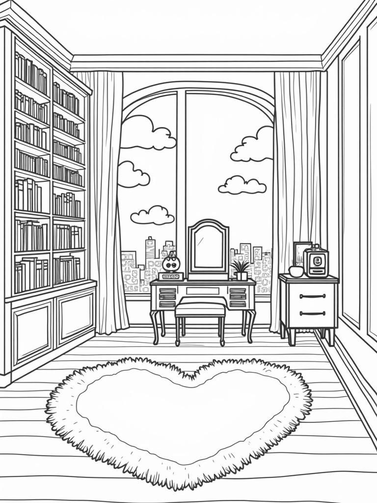 At the center of it all is a plush heart-shaped rug that makes the space feel warm and inviting. It’s the perfect spot to sit and let your imagination run wild. Outside the large window, you can see a sunny skyline filled with fluffy clouds that look like hearts and stars, adding a touch of magic to the whole scene.