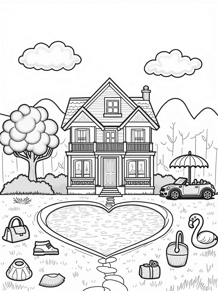 Dreamhouse Landscape with Dollhouse and Heart-Shaped Pool Coloring Page