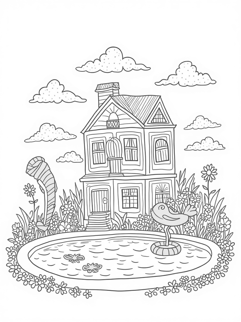 Dreamhouse Made of Building Blocks with Fairies and a Pool Coloring Page