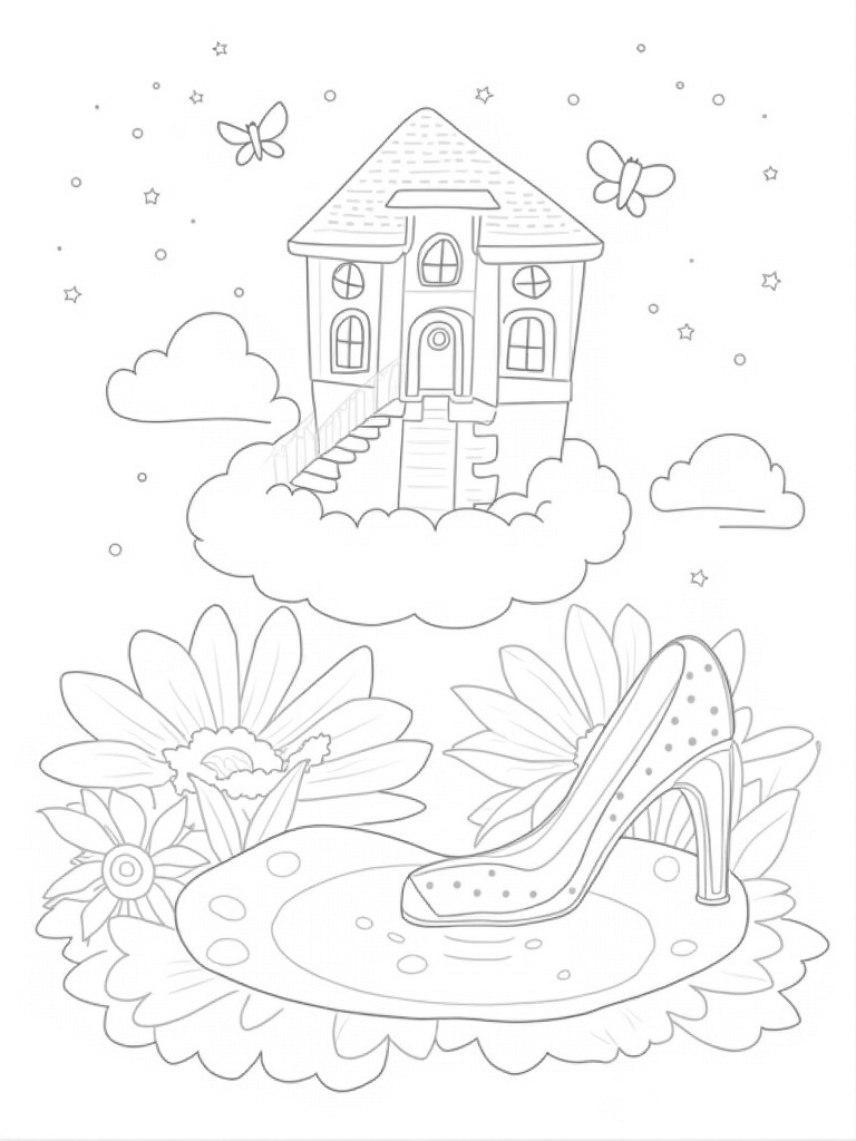 This coloring page showcases a dreamy house floating on a giant pastel cloud. The house has cute, multi-colored windows and a fun spiraling staircase made of candy canes. Below, oversized flowers with polka dot petals surround a shimmering heart-shaped pool that sparkles in the sunlight.