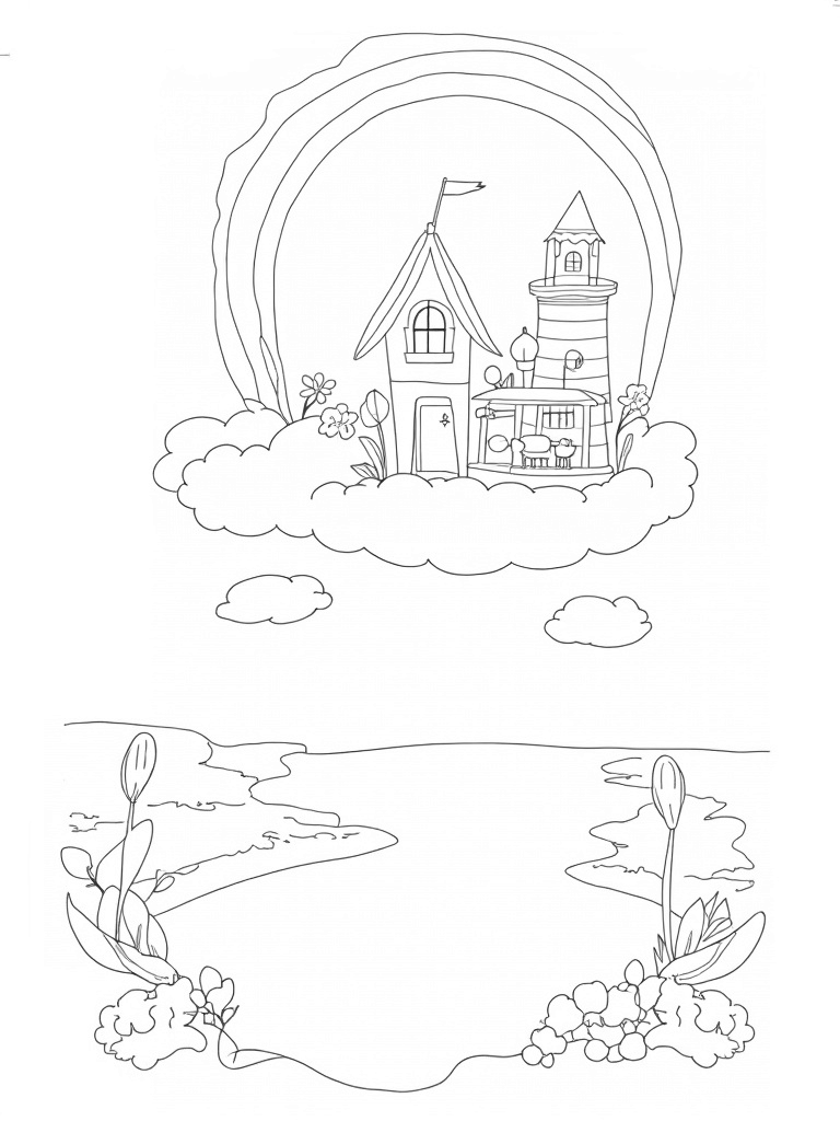 Dreamhouse on a Cloud with Rainbow and Carousel Coloring Page