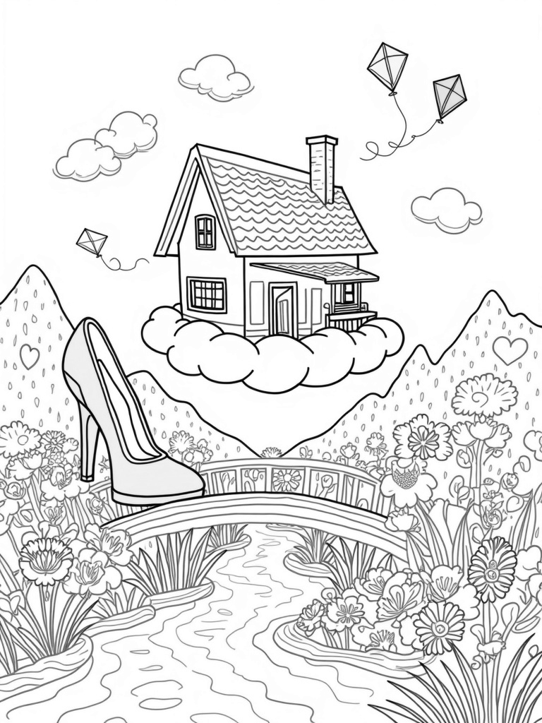 Surrounding the dreamhouse is a vibrant garden filled with gigantic flowers that have playful patterns. Each flower is bursting with color, just waiting for your favorite shades. And if you look a little further, you’ll see a rainbow bridge stretching over a shimmering stream made of liquid glitter. In the background, fluffy marshmallow mountains stand tall, with tiny kites soaring happily in the sky. There’s so much to color in this whimsical world!