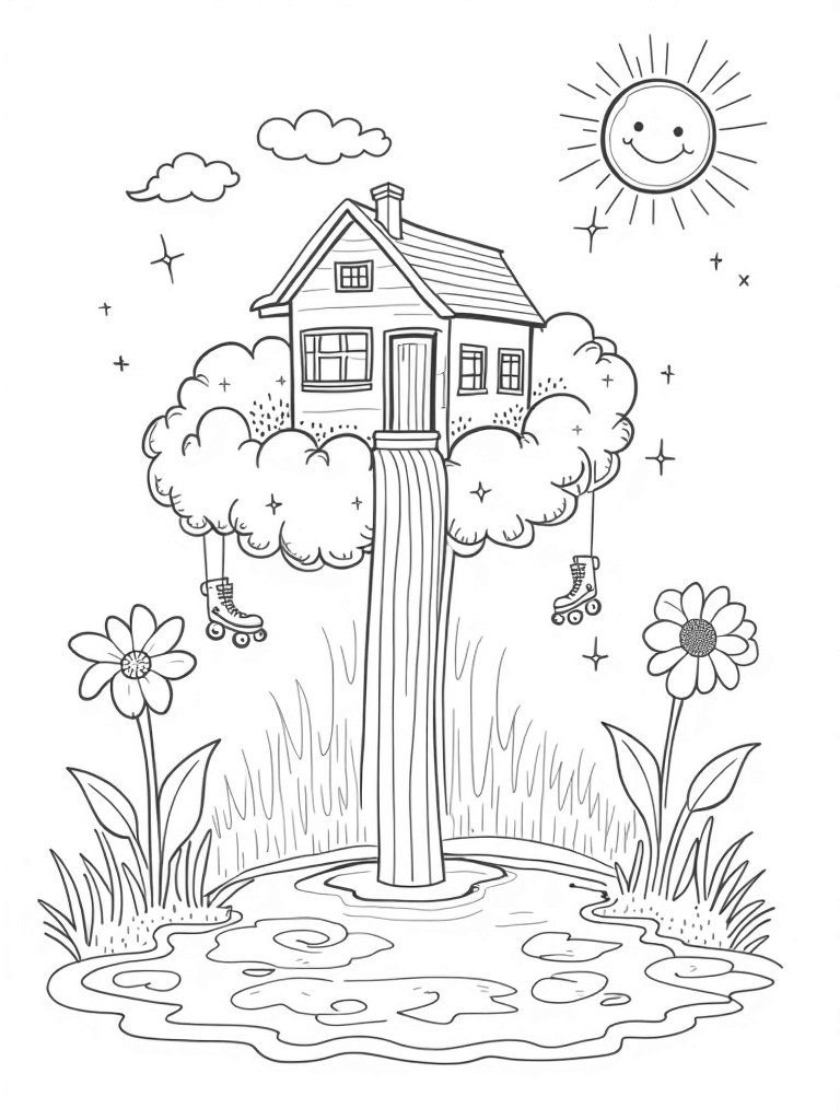 Imagine a magical dreamhouse resting atop a fluffy pink cloud! The house has oversized windows that let in lots of light, and a shiny balcony decorated with twinkling stars. Below, a rainbow waterfall spills into a peaceful pond, where heart-shaped lily pads float gently. Nearby, giant flowers bloom in all sorts of fun shapes, and look closely—there are even roller skates hanging from a swinging branch!