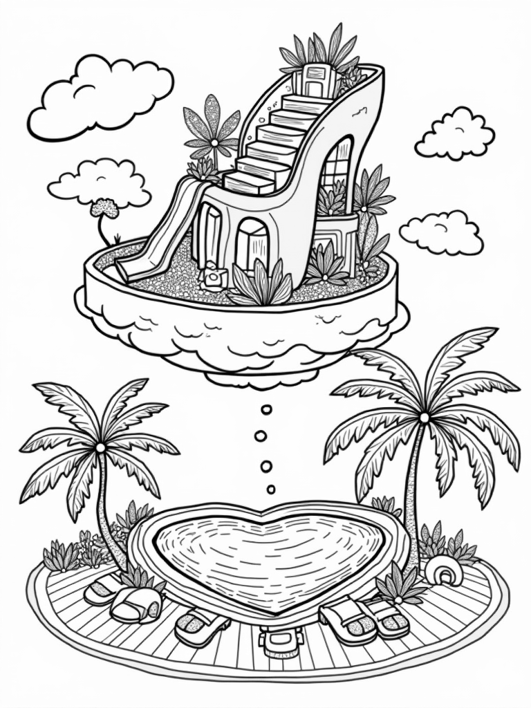Dreamhouse on Clouds with a Pink High Heel Slide Coloring Page