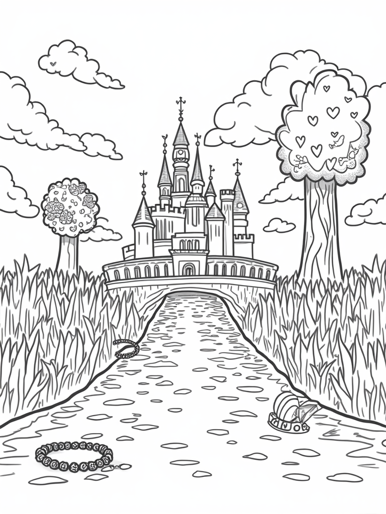 Look closely at the ground, and you’ll find fun accessories scattered around. There’s a necklace made of colorful beads, a tiny tiara just waiting to be adorned, and a vibrant handbag that adds a pop of color. These little touches invite kids to let their imaginations run wild. They can add their own flair to the scene with crayons or markers, turning this enchanting world into their own masterpiece!