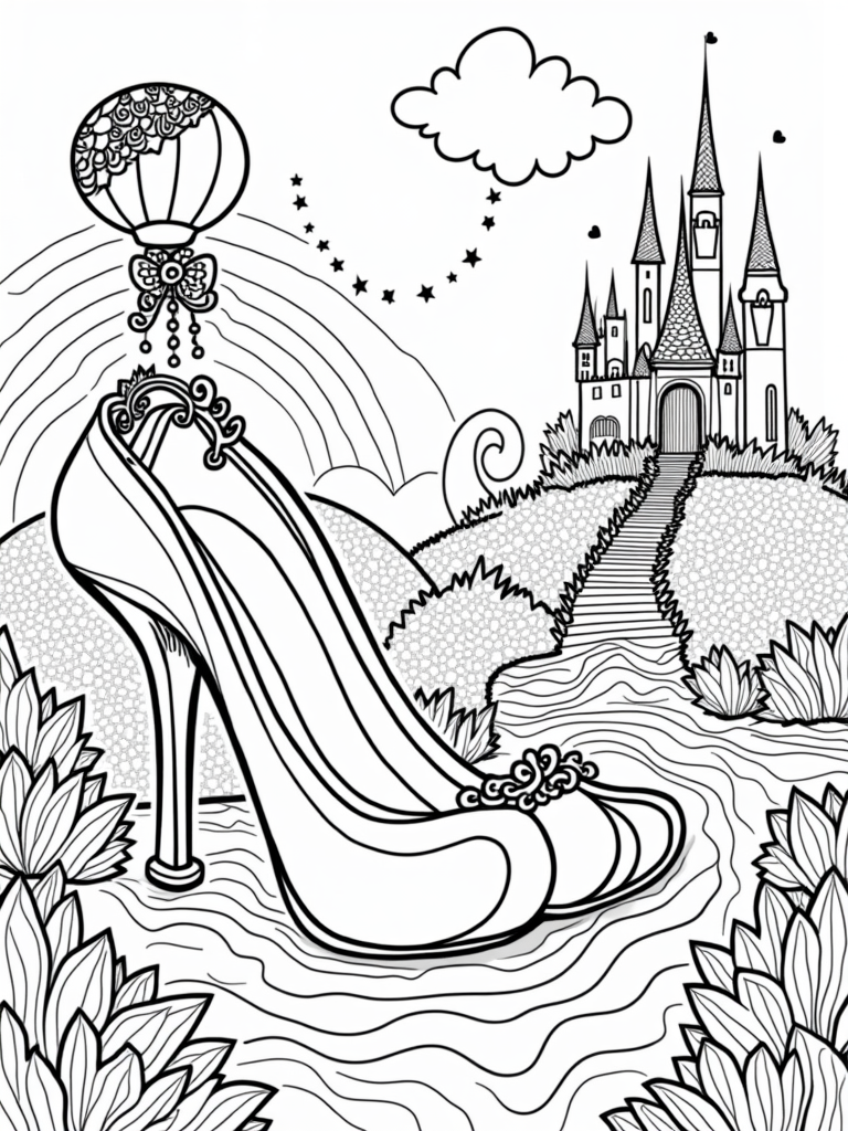 Above it all, a fluffy cloud shaped like a star drifts by. It’s the perfect setting for some imaginative coloring fun. With the candy-colored flowers lining the path, there’s no shortage of inspiration in this dreamland. Grab your crayons and let your creativity shine!