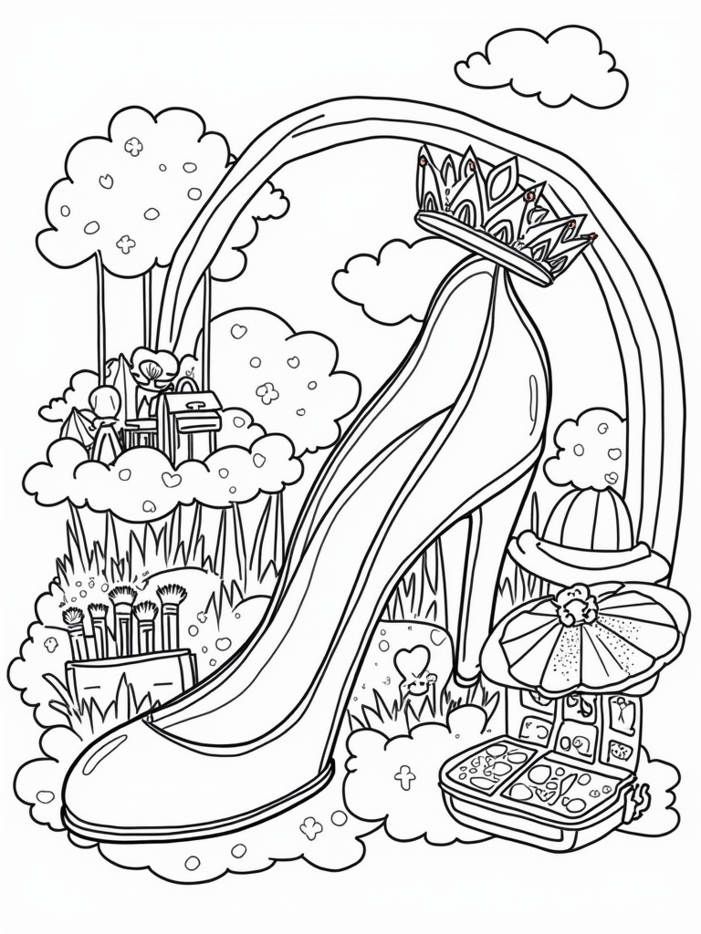Imagine a place where fashion comes to life! In this coloring page, you’ll see a giant pink high-heeled shoe that’s not just for wearing—it’s a slide that leads down into a fluffy cotton candy cloud. How fun would it be to slide down and land in a world of sweetness? Nearby, there’s a sparkling tiara floating above a colorful makeup palette that looks like it’s ready for a beauty party. And those brushes? They stand tall like trees, making the scene even more magical!